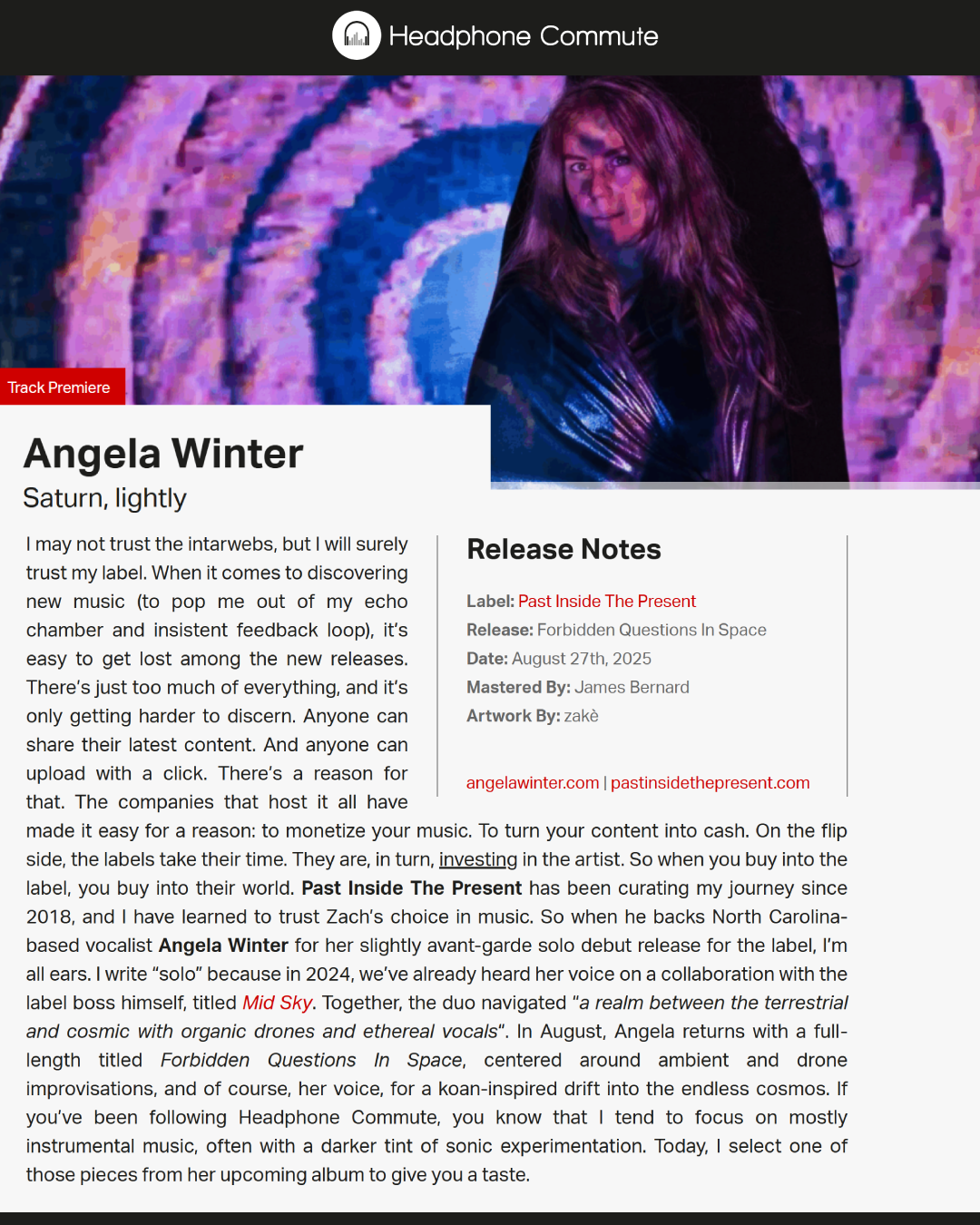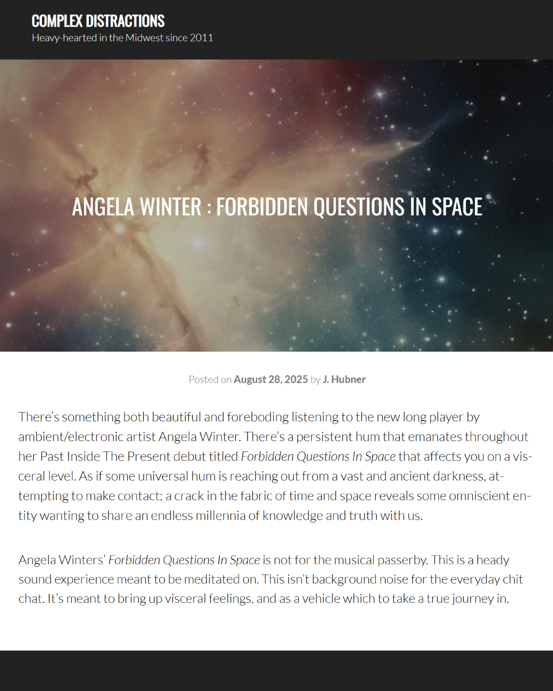 Forbidden Questions In Space is a haunting, koan-inspired journey of ambient, vocal, and drone improvisations. Born from Zen riddles and cosmic wonder, Angela Winter transforms existential dread into spacious, contemplative soundscapes. It asks: How do we meet the world as it is? The result is meditative and stirring, an invitation to let go of certainty and awaken to beauty in the unknown.